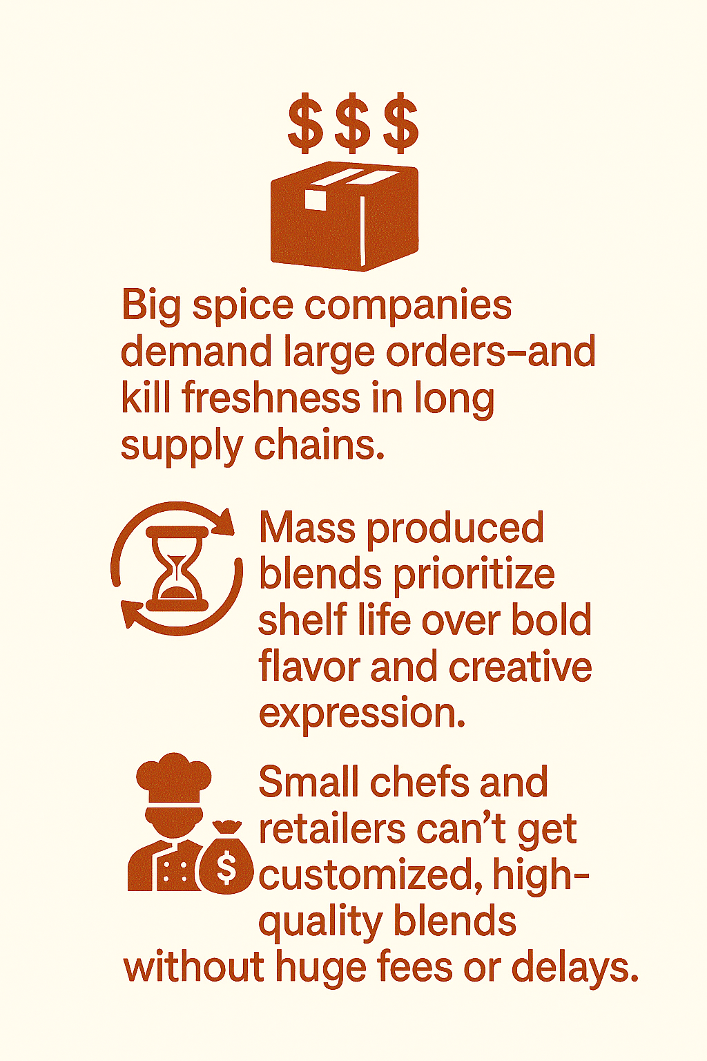 - Small chefs and retailers can't get customized, high-quality blends without huge fees or delays.