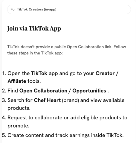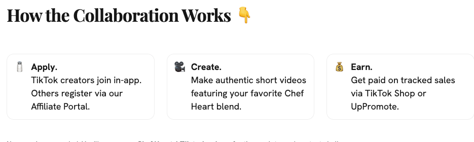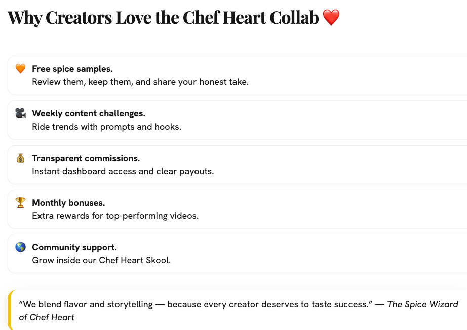 As a Collaborator, you’ll gain access to exclusive spice blends, affiliate commissions, and creative tools to help you grow your influence while connecting audiences through taste and emotion. Whether you film in your kitchen, post reviews, or tell stories that make people smile, Chef Heart helps you turn your creativity into income.